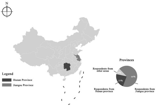 The online questionnaire was designed based on the basic TPB model [31,59,83]. In total, 25 question items were included in the online questionnaire, of which the first part is related to respondents’ demographical characteristics, socioeconomic status, dwelling conditions, and the frequency of visiting UGSs. The second part of the questionnaire is made up of five principal constructs of items for collecting the data of respondents’ attitudes, subjective norms, perceived behavior control, the COVID-19 related knowledge, and their risk perception while visiting UGSs. These five psychological constructs were evaluated with two or three question items on a Likert scale from 1 (strongly disagree) to 7 (strongly agree). The order between question items was slightly modified according to the feedback from the small samples test before the mass online distribution. The online data collection was finished before October 2020 mostly for Chinese students studying in Hunan and Jiangsu Provinces, China. The qualified respondents are required to be elder than 10 years and have the UGSs experience for at least one time in the past 3 years. The respondent spent about 9 min on average completing the questionnaire (see Table A1 Appendix A). Finally, we obtained 608 effective samples, which was considered sufficient to conduct data analysis [84,85].