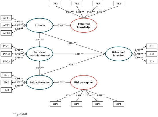 We utilized a maximum likelihood estimation (MLE) algorithm in the SEM process to assess the estimation performance of the hypothesized model based on the theory of planned behavior. As shown in Table 2, the indexes for goodness to fit indicate that the test results are significant.