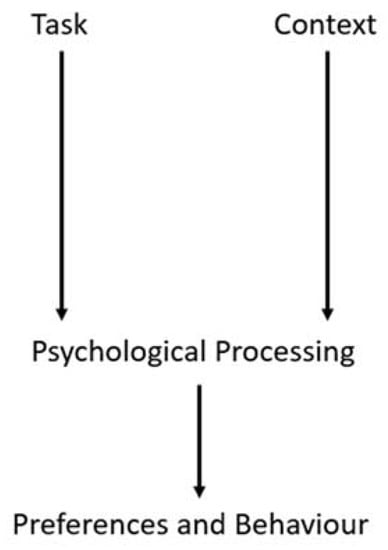 More generally, Ert and Erev [] and Walasek and Stewart [] findings are consistent with contemporary behavioural economics research, which indicates that human risk preferences are not stable and consistent [,,]. Instead, experimental evidence by Kusev and colleagues [] suggests that people’s risk preferences are ‘constructed on the fly’ (see also []; see Figure 1) and can be informed by a range of psychological processes which are sensitive to features of the context and task [,,,,,,,]. Accordingly, in contrast to EUT, SEU and prospect theory, which all assume preference stability, as people’s preferences are constructed rather than revealed, they are unstable across different methods of elicitation [,]. For example, using the certainty equivalent (CE) elicitation method which Tverky and Kahneman [] used to validate prospect theory predictions, Kusev et al. [] demonstrated that the four-fold pattern of risk preferences is an artefact of Tversky and Kahneman’s experimental method. Specifically, they found that during repeated choice between safe (offering a sure monetary amount) and risky gambles, participants demonstrated the four-fold pattern of risk preferences only when the safe options were logarithmically (unevenly) spaced around the expected value of the risky options. In contrast, when the safe options were linearly (evenly) spaced around the expected value of the risky options, participants demonstrated a consistently two-fold pattern of risk preferences (risk-aversion in the domain of gain, and risk-seeking in the domain of loss), which were independent from probability level. Thus, a single methodological change (logarithmic to linear spacing of sure options around the expected values of risky options) had a profound influence on participants’ risky choices.