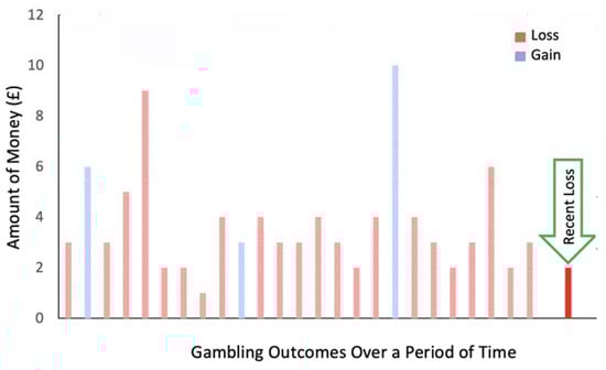 Furthermore, conducted theoretical and experimental research by Kusev and colleagues [] demonstrated that when decision-makers experience events in time series, one at a time serially (dynamically), their attention is drawn to each individual event, granting the current (or most recent) event a salient status. Specifically, Kusev et al. [] found that people tend to anchor on the current (or most recent) event in experienced sequence of events, which has decision-making consequences on how accurately people evaluate past experiences retrospectively. For example, when people attempt to make retrospective evaluations/judgements of their past experiences, these evaluations are informed and altered by the present/most recent event from the dynamically experienced sequences [] (see Figure 2). Accordingly, it is plausible that the most recent event/gamble, typically resulting in a relatively small loss or rare win, alters the psychological representations of substantial and accumulated loss in the past to a representation of a negligible loss. In other words, people feel better in the present, while they gamble.