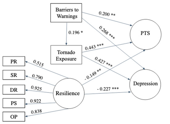 Our first hypothesis (H1) predicted that encountering more barriers to receiving tornado warning alerts would be associated with more tornado exposure. H1 was supported, as results found barriers to tornado warning alerts had a significant and positive relationship with more tornado exposure (β = 0.196, p < 0.05). Next, our second hypothesis (H2a) predicted more barriers to receiving tornado warning alerts would be associated with more PTS and depression symptoms. H2a was confirmed as results found more barriers to warning alerts was related to PTS (β = 0.200, p < 0.01) and depression symptoms (β = 0.268, p < 0.001). Our second hypothesis (H2b) predicted more tornado exposure would have a significant and positive relationship with PTS and depression symptoms. H2b was also confirmed as results found more tornado exposure had a significant and positive relationship with PTS (β = 0.443, p < 0.001) and depression symptoms (β = 0.427, p < 0.001). Finally, our third hypothesis (H3) predicted that higher levels of resilience would have a significant and negative relationship with PTS and depression symptoms. H3 was confirmed as resilience had a significant and inverse relationship with PTS (β = −0.149, p < 0.01) and depression symptoms (β = −0.229, p < 0.001). See Table 2 and Figure 1 for the structural results.