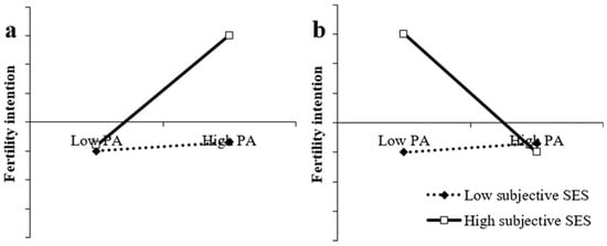 Model of the hypothetical pet attachment × subjective SES interaction depicting (a) an interaction in which pet attachment promotes fertility intention in individuals with high subjective SES but a nonsignificant relationship between pet attachment and fertility intention in individuals with low subjective SES; (b) an interaction in which pet attachment inhibits fertility intention in individuals with high subjective SES but a nonsignificant relationship between pet attachment and fertility intention in individuals with low subjective SES.