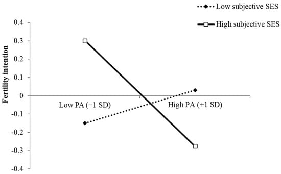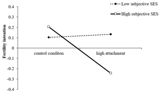 However, the association between pet attachment and fertility intention might be different for childbearing-aged individuals with different levels of subjective SES. Subjective SES represents the perception of one’s own socioeconomic position or rank relative to that of others in the social class hierarchy [30,31]. Subjective SES is correlated with individuals’ objective SES (e.g., education, income), but it also contributes to social thoughts, emotion, and behavior independently of an individual’s objective resources [32]. As subjective SES is often ascribed subjective meaning that is influenced by the situational or broader social context, such as other individuals to whom an individual compares his or her income or educational level [33], the subjective perception of social class has more important insights than objective SES into psychological processes, such as self-perceptions [34], system justification belief [35], and subjective well-being [31].