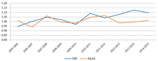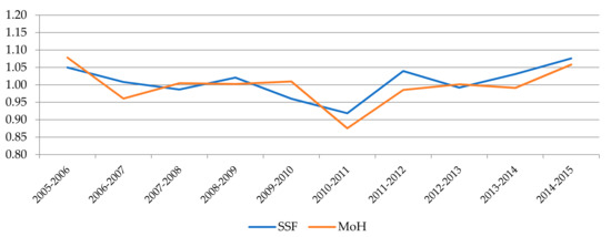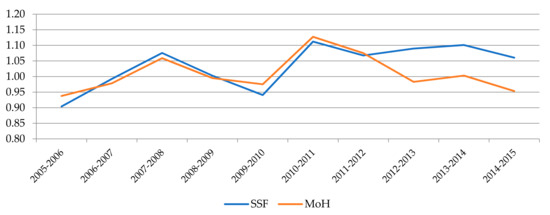Figure 2, Figure 3 and Figure 4 show the evolution experienced by the productivity indexes and their main components (EC and TC) over the years, distinguishing between hospitals belonging to each financing model. In Figure 2 we can notice that the evolution of MPI shows a similar trend for both systems until 2012, when a large gap opened between them as a result of the greater growth experienced by SSF hospitals, while the Ministry´s hospitals suffer a slight drop followed by some stagnation. The main explanation for these divergences observed in the last years of the period can be found in the evolution of technological change (TC), as shown in Figure 4. The analysis of the evolution of the components also allows us to appreciate that the efficiency change (EC) had a negative trend in both models until 2011. Since then, there has been a notable growth in both as well, although it has reached a higher level in SSF hospitals.