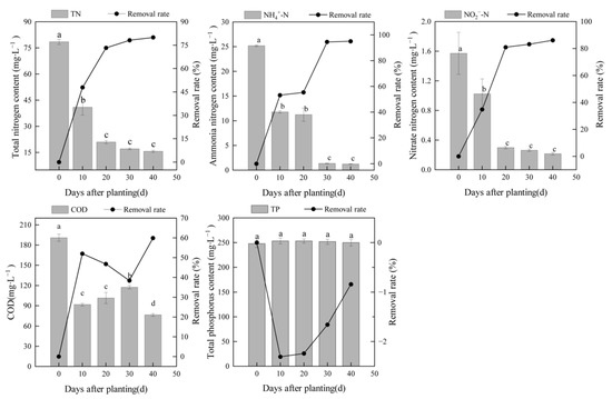 Concentrations and removal rates of TN, NH4+-N, NO2−-N, TP, and COD in the LW lagoon treated by a substrate-free floating constructed wetland planted with water dropwort. Different letters indicate significant differences between different days after planting (p < 0.05).