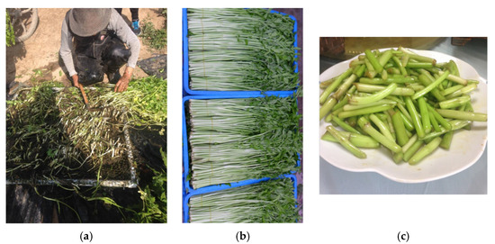 Harvest process of water dropwort for LW purification. (a) Reaping the plants from the floating beds; (b) water dropwort vegetable products for sale; (c) A common dish procured from water dropwort in China.