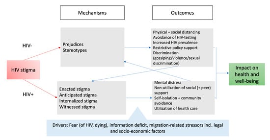 On the level of people living with HIV, four main stigma mechanisms were identified (i.e., enacted, anticipated, internalized and witnessed stigma). Other stressors were not related specifically to HIV, but to migration circumstances that also impacted health and well-being, hindering the use of social (peer) support and the uptake of non-HIV specialized healthcare services. They also led to social withdrawal and avoidance of one’s own community networks. These combined stigma outcomes continuously activated HIV stigma mechanisms. In turn, HIV stigma outcomes among people living with HIV, especially self-isolation and avoidance of own communities, fed HIV stigma mechanisms of community members.
