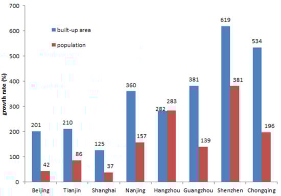 After the economic reform and opening-up policy, with the promotion of China’s rapid urbanization, the level of urbanization and regional development has been greatly improved. The rural society accelerated the transformation to urban society. The number of cities and towns is climbing, and the scale of cities and towns is enlarging. The rapid improvement of urbanization level means that a large amount of the rural population transfer to the city. As a process of population concentration to the city, theoretically speaking, it is conducive to the economical and intensive use of land. However, with the acceleration of China’s urbanization process, the typical fact is the extensive utilization of land. The urban spatial growth in China has a significant feature of non-intensive and disorderly spread. More and more cities have adopted the growth mode of low-density and disorderly outward expansion. Especially in the megacities with urban populations exceeding 2 million and the megacities with an urban population exceeding 1 million, blind spatial expansion is one of the five most serious problems in the process of China’s urbanization. Based on the analysis of the spread and expansion rate of most cities and towns in China, the speed of Land Urbanization “takes the lead” and presents a situation of land being out of control. Except Hangzhou, the growth rate of urban areas in other large and medium-sized cities exceeds that of the population growth rate of the municipal area (Figure 1), which indicates that the phenomenon of low-density spread in large and medium-sized cities is extremely common [1]. In China, a medium-sized city is one whose population varies between 1000,000 and 5000,000, while large cities, including megalopolises, constitute a population of 5000,000 to 10,000,000 and megacities a population over 10,000,000. Large and medium-sized cities have the advantages of a large number of employment opportunities and advanced infrastructure, which constantly attract an influx of population and form industrial agglomeration. However, the expansion of urban construction has not been coordinated in time. A series of negative externalities brought by urban population and industrial agglomeration have seriously affect the quality of life of urban residents.