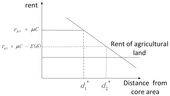 Under the balanced condition, the rent level of urban land is equal to the agricultural land rent level plus the discounted land development cost minus the external benefits of land development. That is to say, due to the existence of external benefits, the local government’s growth performance is affected by the land’s financial dependence, and there is an impulse to expand the scale of construction land. The urban boundary expands from the original balanced to the new balanced , which makes the expansion speed of urban built-up areas far faster than the population growth, and urban sprawl occurs (Figure 2).