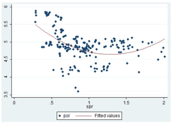 At present, China’s urban sprawl is more serious in large and medium-sized cities [38]. Therefore, this paper chose 35 large and medium-sized cities in China as samples to study the effect of urban sprawl on environmental pollution. Due to the data availability, the sample covers all the sub-provincial cities in China and the provincial capitals of 30 provinces, except Tibet. We not only analyzed the common characteristics of large and medium-sized cities, but also analyzed the regional and intra-regional differences in eastern, central, and Western China so as to obtain rich and substantial research conclusions. In this paper, referring to existing studies and considering the availability of data, the time span of our selected data was 1998–2019, and the above indicators are all from the corresponding annual “China Statistical Yearbook” and “China Urban Statistical Yearbook” (Table 1). The descriptive statistics are shown in Table 2. The mathematical model indicated that urban sprawl impacts environmental pollution in a nonlinear way, in that urban sprawl decreases pollution until a turning point is reached, at which pollution starts to ascend, further visually manifested in the quadratic fitting analysis in Figure 3.