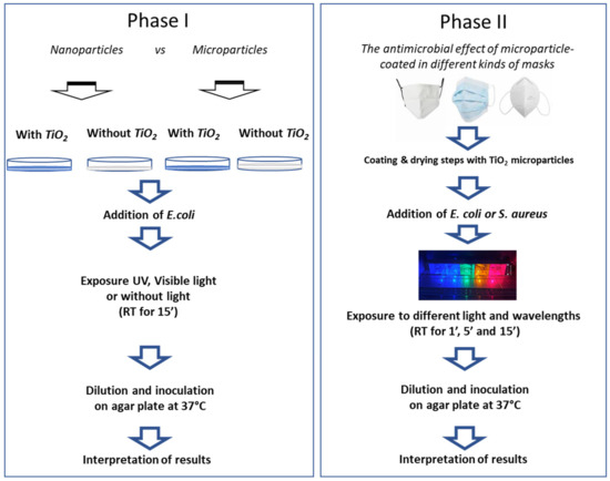 The study was divided into two phases (Figure 1): (i) the investigation of antimicrobial effects of TiO2 microparticles with respect to TiO2 nanoparticles under several light wavelengths; (ii) the antimicrobial effects of microparticle-coated masks: cloth face masks, surgical face masks, and FFP2 masks.