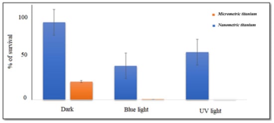 Antimicrobial activity of micrometric and nanometric TiO2 in water. UV and blue light irradiation trigger the antimicrobial potential of TiO2 microparticles, showing an even higher efficiency with respect to nanometric particles. Comparison at different wavelengths (dark, blue light at 450–455 nm and UV-light at 395–400 nm) in water using E. coli as a model after 15-min exposure.