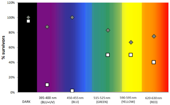 Photocatalytic effectiveness of micrometric TiO2 coated masks at different wavelengths. Experimental contamination of cloth face masks, previously with coated (white square) or without coated (grey rhomb) TiO2 microparticles. Data are expressed as the percentage of survival on agar plates, after 15-min exposures at several wavelengths of the visible spectrum, and using dark (not light exposure) as a control. UV (395–400 nm) and blue light wavelength (450–455 nm) show the highest antibacterial activity (98–100%).