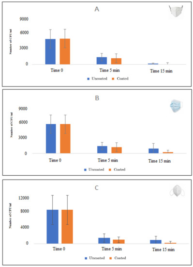 An overnight bacteria suspension (109 CFU/mL) was diluted to 104 CFU/mL in sterile water. To each mask type (treated and not treated)—3 spots, with diameters of 0.5 mm by 2 µL of the suspension 104 CFU/mL, were applied. The bacterial concentration of each spot at Time 0 (T0) was evaluated, seeding serial dilution aliquots of the starting suspension in order to estimate the number of CFUs per microliter of the applied suspension. Coated masks were exposed (described in Section 2.4) for 1, 5, and 15 min. At the end of the exposure, each piece of tissue was removed with sterile tweezers and placed on a selective growth medium to test microorganism growth [59], using Brilliance™ E. coli/coliform selective agar (Oxoid, Detroit, MI, USA) for Escherichia coli and Mannitol Salt Agar (Oxoid, USA) for Staphylococcus aureus. The plates were incubated at 37 ± 1 °C for 18–24 h. The number of bacterial concentrations, at 1, 5, and 15 min, were determined, counting bacterial colonies present in the agar plate, and the number of CFU was reported as CFU/mL. The percentage of surviving bacteria was calculated with respect the T0 microbial load.