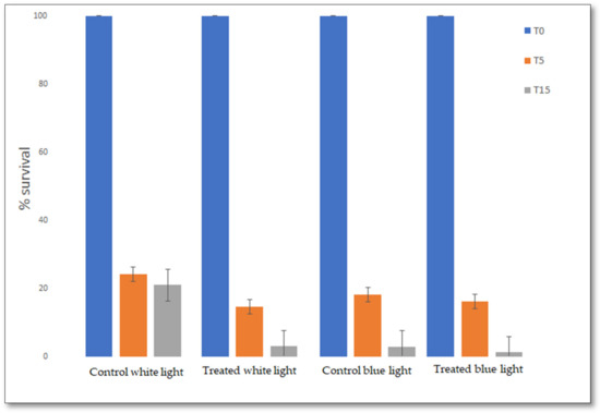 The effect of TiO2-coating, independently of mask type. The means of all observations obtained with coated or not coated-TiO2 masks are shown as percentages of survival (E. coli CFU/mL) at time 0 (T0), 5 min (T5), and 15 (T15) minutes of exposure of white-visible and blue light. The combination of visible light irradiation and TiO2-coated show an enhancement of the antimicrobial activity, suggesting that the coating of TiO2 can be useful with visible light irradiation and independently of the type of mask.