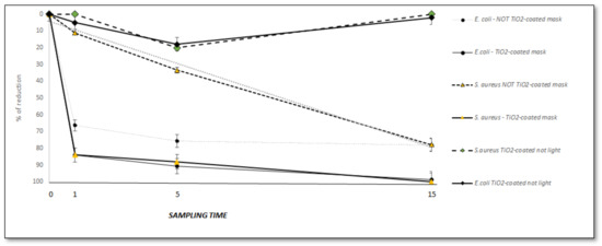 The reduction trend of E. coli and S. aureus in the FFP2 mask coated by TiO2. The percentage of the reduction of E. coli and S. aureus as a function of the times of exposure at blue light are reported. The level of E. coli and S. aureus decreases with increasing times of exposure at blue light, but a significant enhancement of the antimicrobial activity was observed when exposing coated-TiO2 masks. Sampling times were 0, 5, and 15 min.