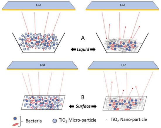 Hypothetical impact of granulometry on the light penetrance and photocatalytic interaction. Putative theoretical model to explain the enhanced effect of micrometric vs. nanometric particles. A reflexing-refraction interference and roughness may favor the interaction between light and microparticles, respectively, in a water suspension or on a coated surface. Specific strategies for fixing particles on a matrix (e.g., chitosan, polysilicon, or others reported in Table 2), may further enhance the light effect. Gram positive and Gram negative bacteria (1 µm) are reported in blue and red, respectively.