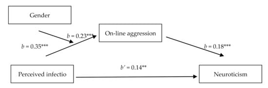Using the Process macro (Model 1) [71] with 95% bias-corrected and accelerated confidence intervals and 5000 bootstrap resamples, we examined the potential interaction effect of perceived infection (mean-centered) and gender (men = 1; women = 0) on neuroticism and on-line aggression, with age, education, and SES being controlled. The results reveal a significant interaction between perceived infection and gender on neuroticism, β = 0.43, SE = 0.10, t = 4.13, p < 0.001 (see Figure 1). Simple slopes analyses indicated that, for men, perceived infection was positively associated with neuroticism, β = 0.43, p < 0.001; however, this association was not found for women, β = −0.0004, p = 0.996.