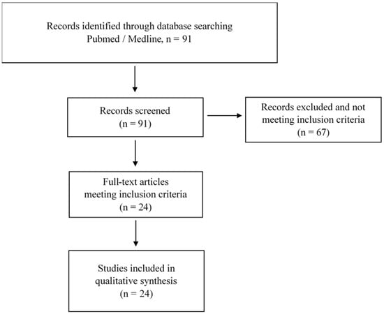 Figure 1 presents the selection process. To perform this review, the Pubmed, Bookshelf and Medline databases were queried and the PRISMA method was used. A total of 91 articles were identified. Following this search, duplicate references were removed. After this identification step, we proceeded to the screening step, which involved sifting through the titles and abstracts to check their relevance. Studies were selected if they were conducted only for marathons and if they studied the impact of this specific running on cardiac fatigue or cardiac stress. Ninety-one papers were selected, and their full texts were reviewed by the authors for inclusion in the review. Following the expertise of the selected articles, 24 papers were considered in the writing of the review.