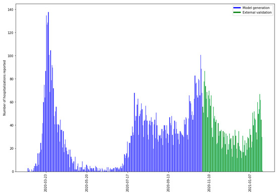 For model building, the pre-processed dataset with information from February 2020 to November 2020 was considered and split into three separate datasets as is usual in machine learning algorithms: 75% for the training model (fitting the model), 12.5% for model validation (selecting the best model configuration [hyperparameter set] from a set of candidates), and 12.5% for model testing (providing unbiased evaluation metrics that give a generalized value of the performance of the fitted model). In addition, a dataset including information from November 2020 to January 2021 was used for external validation of the final model in a different temporal scenario. We recruited the 626 cases distributed during the period shown in Figure 1 (green color) that verify the study inclusion criteria, these data are completely different to the generation model data and thus provide a validation on a different dataset not used for the building models.