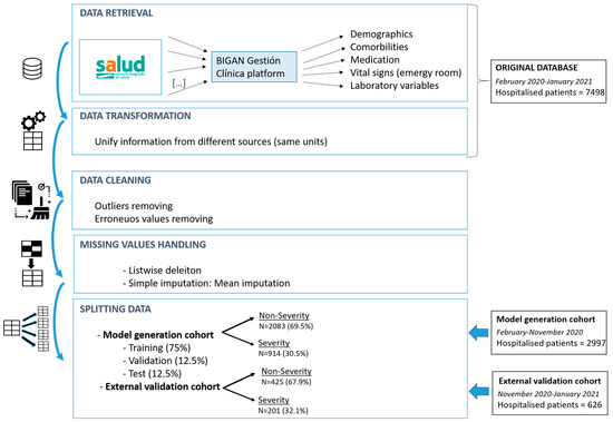 Patient information was retrieved through the BIGAN Gestión Clínica platform of the Department of Health of Aragon. This platform accesses the Aragon Health Records Database, which is the primary data source of SALUD, containing demographic and clinical information on patients. The original database included 7498 patients and 165 variables. The outcome studied was ICU admission or mortality within 30 days of hospital admission, which we will refer to as an unfavourable outcome or severity. Each patient′s demographics, comorbidities, and medication prescribed in the 6 months prior to hospitalization were considered. Vital signs were recorded upon arrival at the emergency room. Laboratory variables were measured in the first 24 h. This laboratory information was only available for the largest two hospitals of the SALUD network, which accounted for more than 60% of all patients admitted with COVID-19 in the Aragon region during the study period.