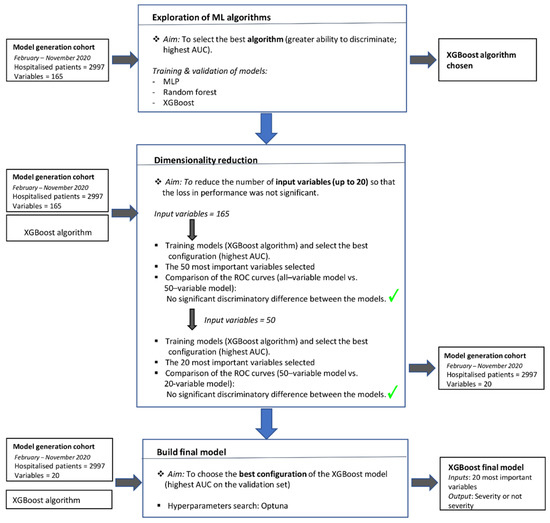 Second, a stepwise procedure was followed to reduce the number of variables (simpler models) so that the loss in performance was not significant. Models were initially trained using all 165 variables. After the best model with all variables was selected, i.e., the model with the highest discriminatory ability over the validation set, the importance of the variables was calculated and the 50 most important variables selected by means of the XGBoost algorithm. The process was repeated for the dataset using the 50 variables, selecting the 20 most significant variables. The final model was generated by using the dataset with 20 variables.