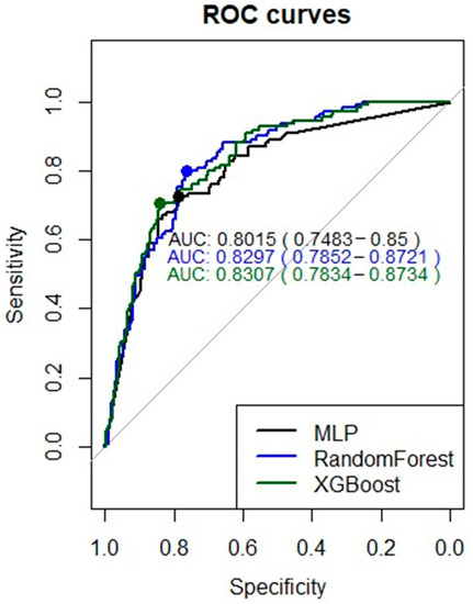 The ROC curves of the best models for each ML algorithm on the test dataset are shown in Figure 4. The AUCs obtained by the algorithms that combine decision trees (i.e., random forest and XGBoost) were superior to those obtained by the MLP, with XGBoost achieving the best performance (AUC = 0.8307). The curve comparison test showed a significant predictive improvement (p = 0.043) by considering the XGBoost model vs. MLP.