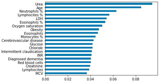 For the best algorithm (XGBoost), Table 4 shows the set of hyperparameters for which the best models were attained considering all variables, the 50 best variables, or the 20 best variables as candidate variables. Figure 5 is an importance diagram of the 20 variables that were finally selected.
