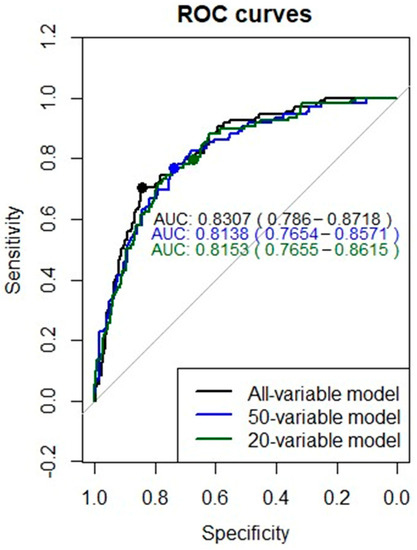 Finally, the ROC curves for the final models analysing all variables, 50 variables, and 20 variables on the test dataset are shown in Figure 6. The AUC comparison revealed non-significant predictive improvement or loss (p > 0.1) when considering the best model with the 165 source variables (AUC = 0.8307; 95% CI 0.7856–0.8718), the best model with the 50 most important variables (AUC = 0.8138; 95% CI 0.7654–0.8571), and the best model with the 20 most important variables (AUC = 0.8153; 95% CI 0.7655–0.8615). Therefore, the most robust and parsimonious choice was to consider the 20-variable model as the final model due to its simplicity without loss of predictive capacity.