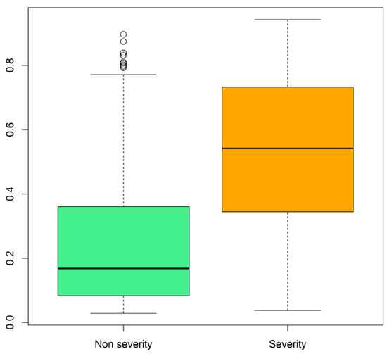 Regarding the model validation, Figure 7 shows the boxplots for each real class (non-severity; severity, respectively) on the external validation dataset. The distribution of the probabilities predicted by the model for non-severity patients (green box) was clearly under the distribution of probabilities for severity patients in the red box. Thus, we observed good discrimination ability for the predictive model and a possible threshold of 0.4 that can separate the two groups.