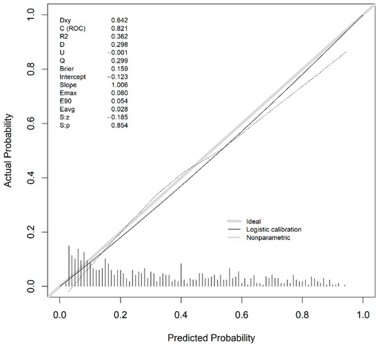 Regarding calibration, Xie et al. [39], despite achieving excellent discrimination (C index = 0.98), obtained a calibration that had a slope > 1 (probabilities too high for low-risk patients and too low for high-risk patients). Our model achieved good discrimination with the external validation set (AUC = 0.821, 95% CI 0.787–0.854) and accurate calibration (slope = 1, intercept = −0.12) [55], which means that the predicted probabilities are close to the expected probability distribution.