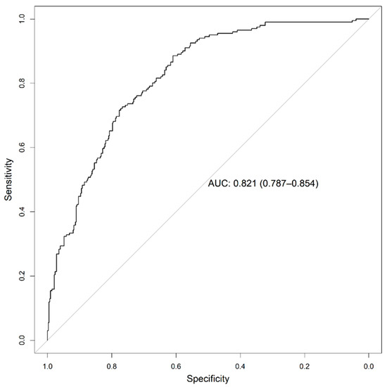 Figure 8 shows good agreement between the predicted probabilities and real outcome in our external validation, with an intercept of −0.123 and a slope of 1.006. Moreover, the ROC curve (Figure 9, AUC = 0.821; 95% CI 0.787–0.854) demonstrates no loss in predictive ability in the external validation. The Youden index (4) was obtained with a specificity (2) and sensitivity (3) pair of 0.609 and 0.886, respectively.