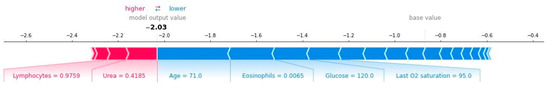 In addition to providing the risk given the patient′s characteristics, the interpretability and explainability of the model were explored to provide more information to the clinician. In particular, using the Shapley technique [50], the tool provides a graphical representation of the Shapley values using Python′s SHAP library [51], which allows interpretation of the direction and intensity of each variable. An example of such a representation provided by the tool for a given patient is shown in Figure 10; the patient′s age (lower than average) contributes the most (has the longest bar) to decreasing the probability of risk, but the amount of urea in the patient contributes to the contrary.