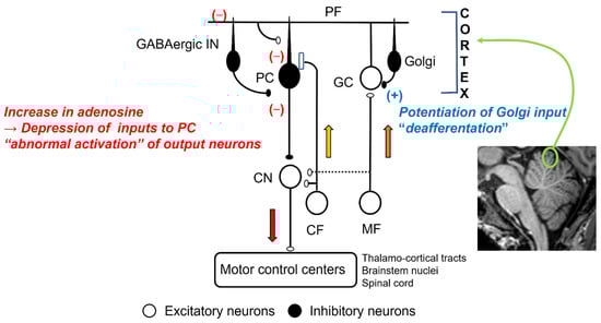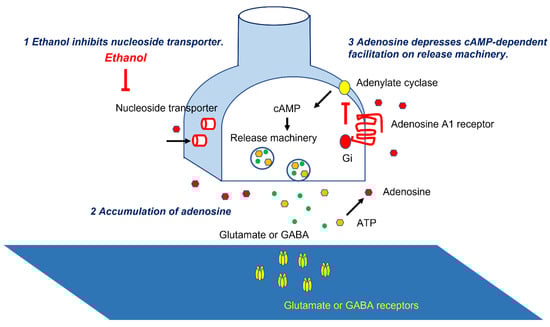 The parallel fibers (PFs), the long axons of the GCs, activate arrays of PCs [14]. PFs also activate inhibitory interneurons (Basket cells and stellate cells), suppressing PCs [14]. Thus, PCs’ activities are under the control of both excitatory and inhibitory inputs (Figure 1). These inputs on PCs are modulated by adenosine. Adenosine, present in the soma and dendrites of PCs [17], inhibits the release of glutamate and GABA from the synaptic terminals through a decrease in cAMP [3,18,19,20,21]. The source of synaptic adenosine is the breakdown of metabolites of ATP released from PFs [22]. Furthermore, nucleoside transporters also regulate extraneuronal and synaptic levels of adenosine [23]. Ethanol blocks the uptake of adenosine through the inhibition of ethanol-specific nucleoside transporter (ENT1) [24,25] (Figure 2). Subsequently, there is an accumulation of adenosine in the cerebellar cortex and subsequent potentiation of adenosine-induced inhibition on various synapses, such as excitatory synapses between PFs and PCs and between PFs and Basket cells, and inhibitory synapses between Basket cells and PCs [3]. The net effect is inadequate activation of the PCs and, in turn, the output signals, i.e., “abnormal activation” (Figure 1) [3]. These abnormal patterns of discharges will have widespread effects on cerebellar targets.