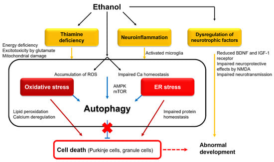 Adult and fetal cerebellar neurons are vulnerable to chronic ethanol exposure. In both pathologies, oxidative stress and ER stress are the core pro-apoptotic pathways [102]. These pathways are induced by a thiamine-deficient environment, especially in alcohol abuse, and exacerbated by neuroinflammation, especially fetal ethanol exposure. The interactions between ethanol, neuroinflammation, and the neuroimmune system open perspectives for therapies in FASD [103]. Although autophagy originally serves as a potential protective response to ethanol-induced neurotoxicity, prolonged exposure to ethanol dysregulates the autophagic protection against oxidative and ER stresses. Such overlapping pathological mechanisms suggest crosstalk between cell degeneration and abnormal development. Notably, these cascading mechanisms exist in other etiologies, such as ischemia and the growingly recognized immune-mediated cerebellar ataxias [104]. Thus, further studies on ethanol-induced cell death could provide new clues to the understanding of cerebellar cell death.