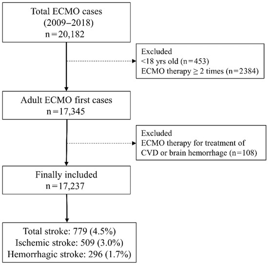 In this study, the health records were extracted from the NHIS database. As the sole public health insurance system, information regarding all disease diagnoses and prescriptions corresponding to drugs and/or procedures had to be registered in the NHIS database by physicians for patients to receive financial support for any diagnostic test and treatment charges in South Korea. This study included all adult patients (aged ≥ 18 years old) who received ECMO support in the intensive care unit (ICU; outside the operating room) after hospitalization from 2009 to 2018 (10 years). The cases of Novalung therapy were not considered for ECMO in this study. For patients who received two or more episodes of ECMO therapy, only the first episode of ECMO therapy was considered in this study. Additionally, cases of ECMO therapy for stroke treatment were excluded from the analysis because we focused on the newly developed stroke after initiating ECMO. As the NHIS did not provide distinguishable prescription codes for venoarterial (VA) and VV ECMO, we classified all ECMO patients into three groups using main diagnosis at ECMO therapy: (1) cardiovascular group (cardiovascular disease, shock, or post-cardiac arrest), (2) respiratory group (ARDS or respiratory failure), and (3) other group. The NHIS contains the records of all diagnoses made during hospitalization; the diagnosis registered as the primary morbidity of treatment was then classified as the main diagnosis.