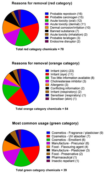 Chemicals that fell into the green category included benzyl and methyl salicylate, which have been used in human volunteer decontamination studies [4,13,14], low toxicity insect repellent such as N,N-Diethyl-meta-toluamide (DEET), and plant secondary metabolites and derivatives such as ammonium glychryzzate, rosmarinic acid, and curcumin. Predictably, many chemicals found in commercially available topical sunscreens were also identified. These included avobenzone, octocrylene, and octyl methoxycinnamate. Figure 2 shows the reasons for removal of red and orange category chemicals and the predominant use of the green category chemicals.