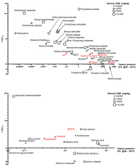 logKow and vapour pressure are the most important physicochemical properties defining the usefulness of chemicals for assessment of dermal penetration, a commonly measured parameter in human decontamination studies. It is well known that lipophilic compounds (positive values of logKow) have the ability to “pool” within the stratum corneum and deeper layers of tissue, a phenomenon sometimes referred to as the reservoir concept [64,65] and proportional to the magnitude of logKow. Decontamination efficacy is chemical dependant, and logKow has a direct effect on this.