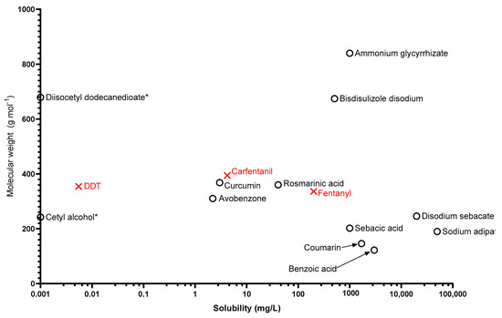 The solid compounds in the green category are plotted according to water solubility and molecular weight. (*) indicates 0 mg/L solubility despite 0 being undefined on a logarithmic scale.