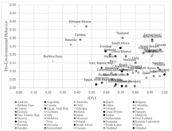 Controlling for GDPPC, there was a negative association between IDVI score and pro-environmental activity (b = −0.32, SE = 0.11, p = 0.007). Using the PROCESS Macro version 3.5 [], we further examined the possible mediation of this effect. Consistent with our prediction, the results showed that the association between the IDVI and pro-environmental behavior was mediated by environmental concern (Figure 1). When environmental concern was added to the model, the IDVI (b = −0.23, SE = 0.11, p = 0.043, 95% CI = (−0.45, −0.01)) was significantly negative associated with pro-environmental behaviors, whereas environmental concern (b = 0.17, SE = 0.05, p = 0.002, 95% CI = (0.06, 0.28)) was significantly positively associated with pro-environmental behaviors. The IDVI was positively associated with environmental concern (b = −0.54, SE = 0.31, p = 0.086, 95% CI = (−1.15, 0.08)). The direct effect size of the mediation was −0.23 (95% CI = (−0.45, −0.01)). The indirect effect of IDVI on pro-environmental behaviors through environmental concern was −0.09 (95% CI = (−0.22, −0.002)). People from societies with a lower IDVI score (indicating greater vulnerability to infectious diseases) showed a greater level of environmental concern, and were therefore more active in environmental organizations (Figure 2).