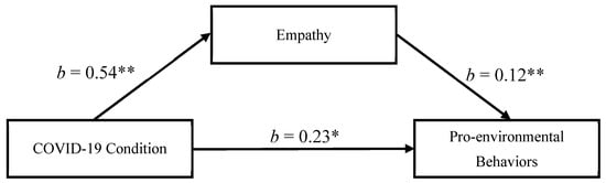 The mediation analysis using the PROCESS Macro version 3.5 [] with condition as the independent variable, empathy as the mediator, and pro-environmental behavior as the dependent variable revealed a significant mediation effect. As shown in Figure 3, participants in experimental condition reported more empathy (b = 0.54, SE = 0.17, p = 0.002, 95% CI = (0.20, 0.87)) than did the control group. Empathy was associated with more pro-environmental behaviors (b = 0.12, SE = 0.05, p = 0.009, 95% CI = (0.03, 0.21)). After taking the effect of empathy into account, the direct effect size of the mediation was b = 0.23, SE = 0.11, p = 0.037, 95% CI = (0.01, 0.44)). Importantly, the indirect effect was 0.06 (95% CI = (0.01, 0.14)), showing that empathy was a significant mediator on increasing pro-environmental behaviors (Figure 3). The above results remained significant when not controlling for the covariates.