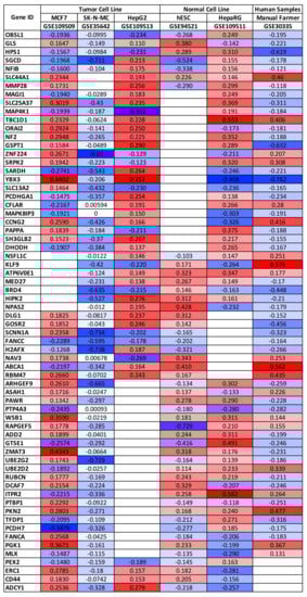Interestingly, only two genes, SLC44A1 and FANCC, showed concordant expression levels in all of the six datasets analyzed being up-regulated and down-regulated, respectively. Contrariwise, the other genes showed a certain heterogeneity in their expression levels observed within each dataset. In detail, all the other genes were up-regulated or down-regulated depending on the type of cell line considered, if normal or tumoral. Indeed, it is possible to observe a greater gene expression concordance within the three tumor cells (MCF7, SK-N-MC, and HepG2), as well as within the two normal cell lines (HepRG and hESC), together with samples obtained from individuals professionally exposed to pesticides (GSE30335).