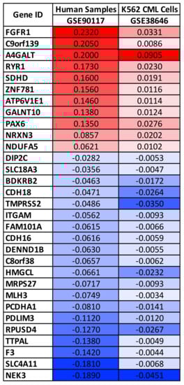 The differential analyses revealed that the highest methylated genes were FGFR1 and A4GALT, while the lowest methylated ones were TMPRSS2, SLC4A11, and NEK3 (Figure 2).