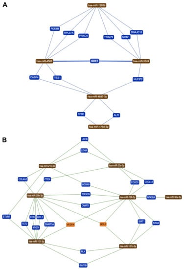 (A) miRNA–mRNA interaction network for the five miRNAs up-regulated after pesticide exposure; (B) miRNA–mRNA interaction network for the 15 miRNAs down-regulated miRNAs after pesticide exposure.