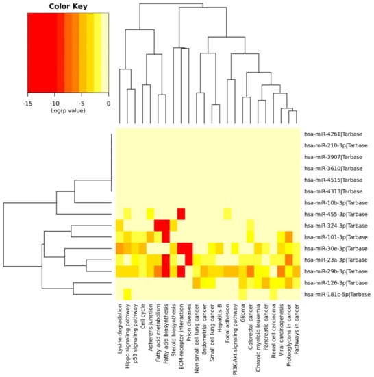 Due to the high number of genes and pathways modulated by the down-regulated miRNAs, it was also possible to obtain a dendrogram summarizing the strongest interaction between the 15 down-regulated miRNAs and the pathways identified (Figure 4).