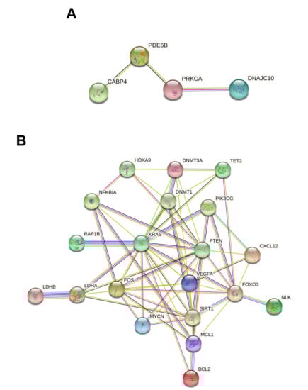 A more complex PPI network was obtained by analyzing the 22 genes modulated by seven of the 15 down-regulated miRNAs, as predicted by miRTargetLink Human analysis. In this case, STRING analysis revealed that 20 out of 22 genes were involved in an integrated PPI network (Figure 5B). In particular, both the number and interaction levels were stronger compared to those observed in the previous string analysis (Figure 5A). Among these 20 interconnected genes, hub genes were KRAS, PTEN, FOXO3, and VEGFA, which established numerous connections with multiple genes. Of note, these genes are recognized as key factors involved in tumor development when dysregulated. STRING analysis also revealed that DNMT3A and DNMT1, involved, respectively, in the de novo DNA methylation and in the maintenance of the methylation status, were strongly interconnected with the aforementioned genes, thus contributing to their alteration. Similarly, SIRT1, responsible for the deacetylation of the proteins involved in the regulation of the cellular response to stress and longevity, showed different interactions both with proteins involved in DNA methylation and with genes involved in the alteration of intracellular signaling (Figure 5B).