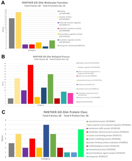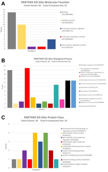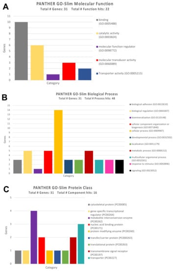 As for the molecular functions, the GO Panther analysis has highlighted how almost 50% of the identified genes (15 genes) were involved in the molecular binding of other proteins, while a large part of them, ten genes, were involved in fundamental cellular catalytic activities (Figure 6A).