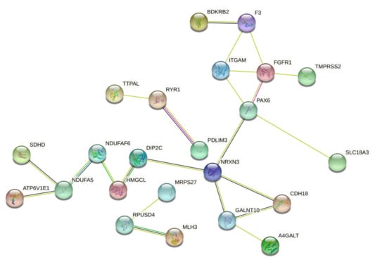 Regarding the PPI network between the 31 methylated and demethylated genes, the STRING analysis showed how these genes form a moderate network where NRXN3 and PAX6 genes, both hypermethylated after pesticide exposure, represented two key nodes (Figure 7). These two genes are fundamental for neuronal and neurovisual development; therefore, these data suggest how epigenetic modifications associated with chronic pesticide exposure could be responsible for the development of nervous dysfunctions, especially for the unborn if exposure occurs during the first weeks of intrauterine life.