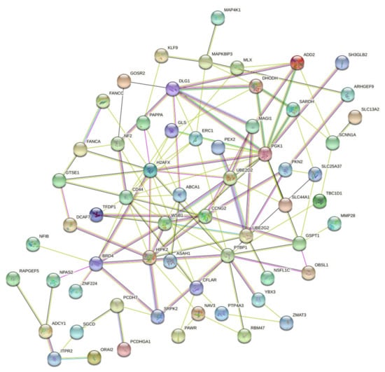 In this latter case, it is possible to identify hub genes strongly interconnected with the identified genetic biomarkers; among these hub genes, PGK1, DLG1, PTBP1, HIPK2, H2AFX, etc. were able to bind different genes involved in different cellular processes such as genes belonging to the MAPK pathway (MAP4K1 and MAPK8IP3), receptor molecules and proteins involved in the degradation of the extracellular matrix (CD44, MMP28, etc.), and proteins with several ontologies.