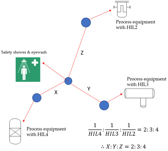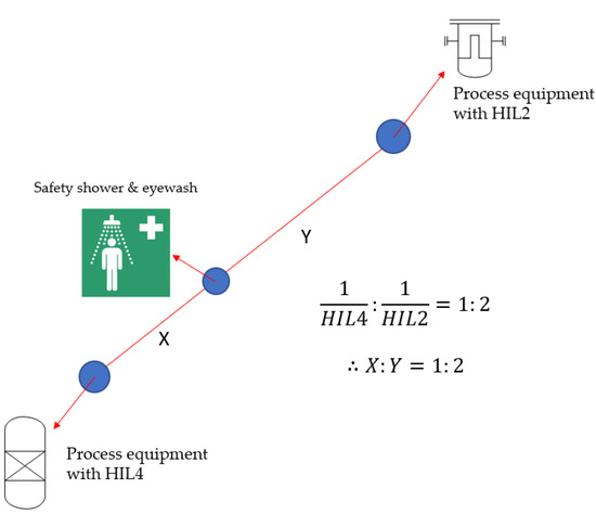 In this study, if two or three process equipment is covered with a single safety shower and eyewash station, it should be positioned relative to the reciprocal of the HIL rating of each process equipment. For process equipment with a higher HIL rating, the operator should be able to reach the safety shower and eyewash station faster than with process equipment with a lower HIL rating.